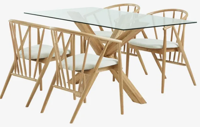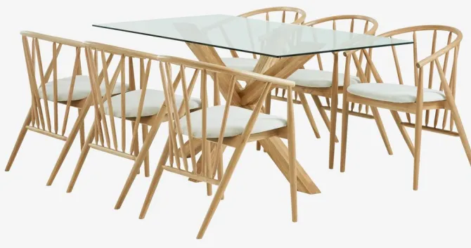 Bord: Massiv eg og hærdet glas. B90 x L160 x H75 cm. Stol: Stof og massiv eg.