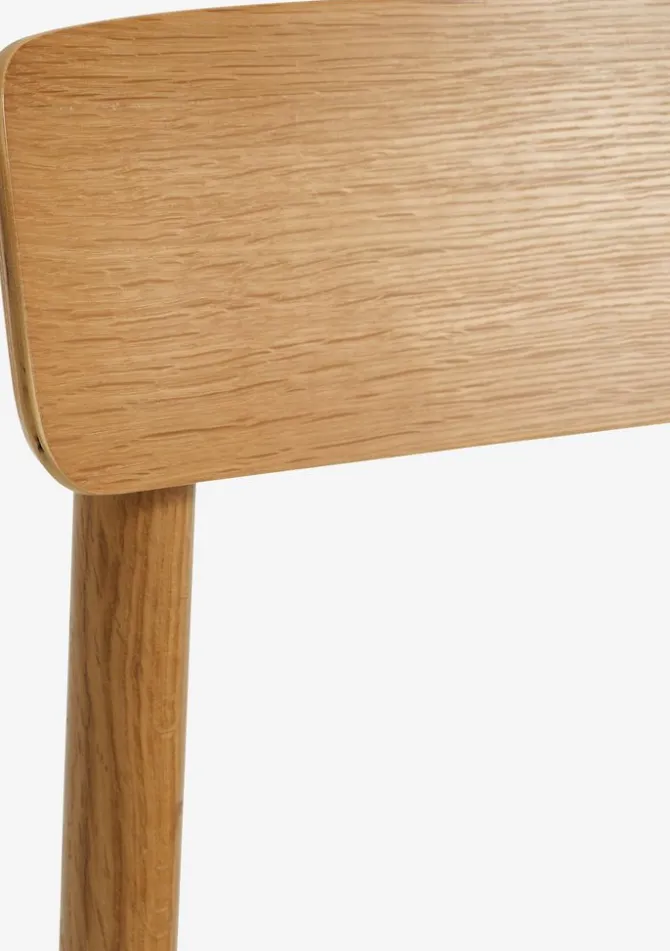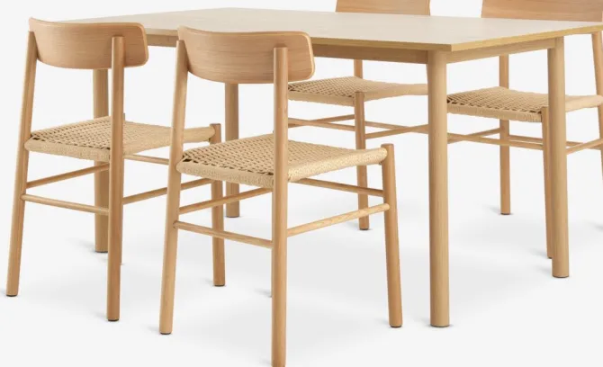 Bord: Kunstfiner og stål. B90 x L160 x H75 cm. Stol: Papirsnor, massiv eg og egefiner.