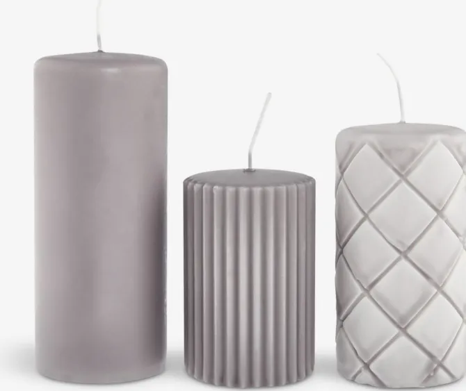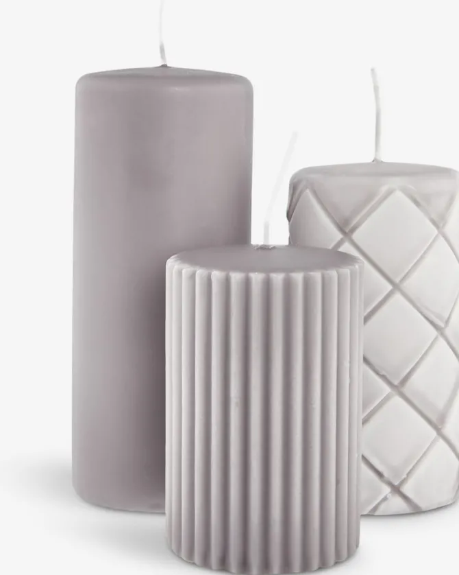 Sæt med tre grå bloklys med forskellige mønstre. Lysene har en glat overflade og kommer i tre forskellige højder, hvilket giver en varieret og dekorativ effekt. Perfekte til at skabe en hyggelig atmosfære i hjemmet med deres lange brændetid. Ø6 x H9/11/14 cm