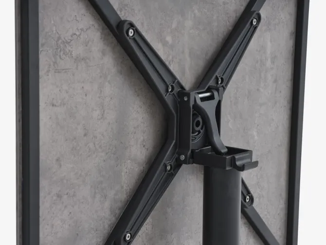 Cafébord med grå bordplade i højtrykslaminat og sort stel i pulverlakeret aluminium. Bordpladen kan vippes helt for kompakt opbevaring. Aluminium er et let og robust materiale, der ikke ruster. B70 x L70 x H73 cm