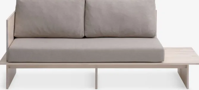Stof. Sæde- og ryghynder i skum. Ramme i massiv fyr. Hynderne kan omarrangeres for at lave en soveplads. B204 x H72 x D78 cm