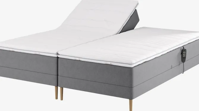 Elevationsseng 180×200 cm med fjernbetjening. 2 madrasser med indbygget elevationsbund og pocket-fjedre 240/m², polstret med purskum. Madrassen er inddelt i 7 komfortzoner hvilket giver en unik, ergonomisk korrekt støtte. 2 topmadrasser, 6 cm tyk med kerne af purskum. Betrækket er blevet behandlet med blødgørende aloe vera. Inkl. ben. Ekskl. gavl.