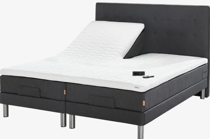 Elevationsseng 180×200 cm med trådløs fjernbetjening. 2 springmadrasser med pocket-fjedre 250/m², polstret med purskum. Madrasserne er inddelt i 7 komfortzoner, hvilket giver en unik, ergonomisk korrekt støtte. 1 topmadras, 8 cm tyk med praktisk snit i hovedenden. Med denne topmadras undgår du revnen mellem sengene, og snittet gør at hovedenderne kan bevæge sig uafhængigt af hinanden. Madrassen har kerne af åndbar latex, der effektivt leder overskydende varme væk. Vaskbart betræk med blød, kraftig quiltning. 2 elevationsbunde. Sengebundene kan give vibrationsmassage med timer og har 3 indstillinger for massagetype. Inkl. ben. Ekskl. gavl.