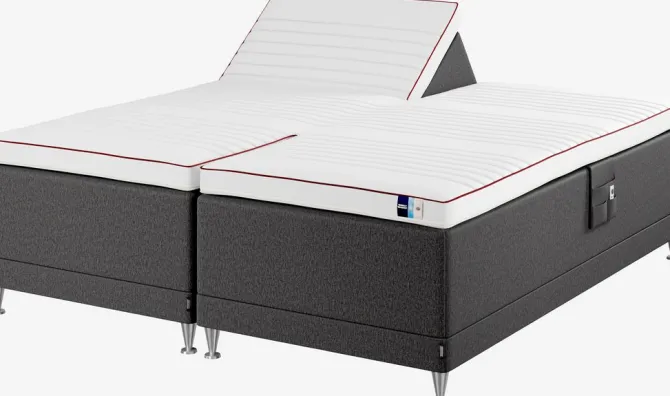 Elevationsseng 180×200 cm med trådløs fjernbetjening. 2 madrasser med indbygget elevationsbund og pocket-fjedre 225/m², inddelt i 9 komfortzoner. Polstret med åndbar Cooltex Breeze. 1 topmadras, 10 cm tyk med et praktisk snit i hoved- og fodenden. Med denne topmadras undgår du revnen mellem sengene, og snittet gør, at hoved- og fodenderne kan bevæge sig uafhængigt af hinanden. Madrassen er med kerne af åndbar latex, der effektivt leder overskydende varme væk. Vaskbart betræk med blød, kraftig quiltning. Betrækket indeholder kølende og temperaturregulerende TEMPRAKON® rumteknologi, hvilket skaber et tørt og behageligt sovemiljø. Inkl. ben. Ekskl. gavl.