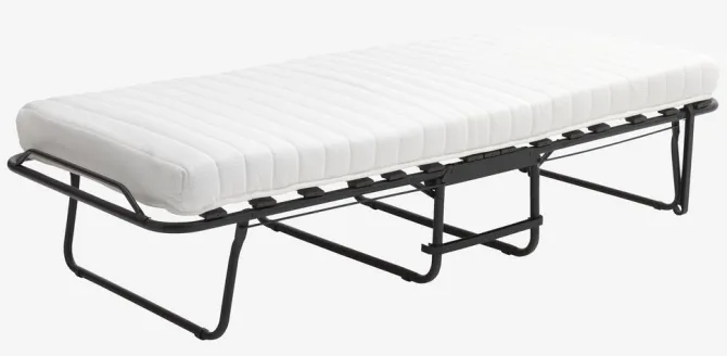 Stål. 11 cm tyk madras med kerne af trykaflastende memory foam og polyuretanskum. Med lameller. Kan klappes sammen. B80 x L193 x H45 cm