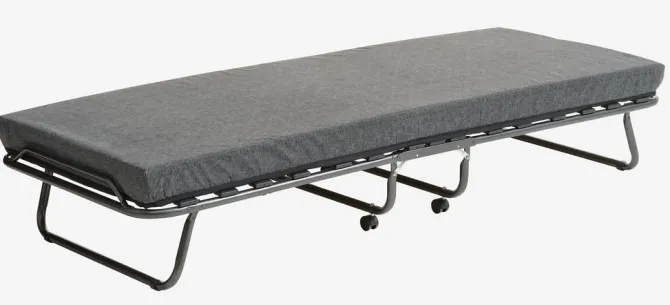 Stål. 8 cm tyk madras med kerne af polyuretanskum. Med lameller. Kan klappes sammen. B80 x L190 x H35 cm