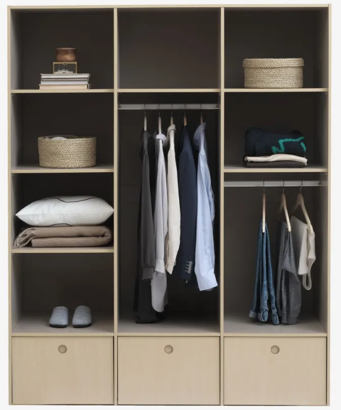 Kunstfiner. Låger med soft-close. Skuffer med soft-close. Skabets indretning: 6 hylder og 2 bøjlestænger. B160 x H200 x D59 cm