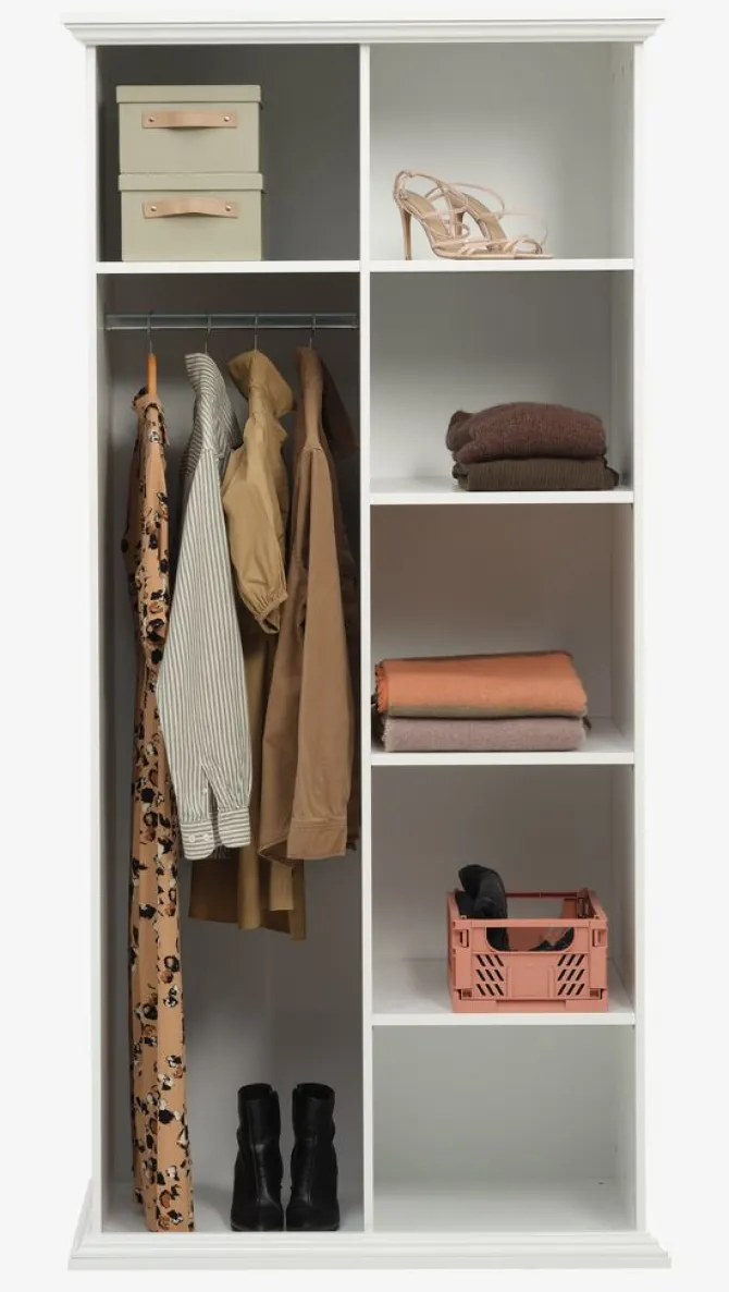 Kunstfiner. Skabets indretning: 5 hylder og 1 bøjlestang. B96 x H200 x D64 cm