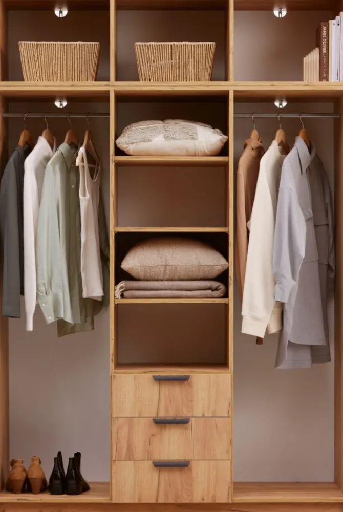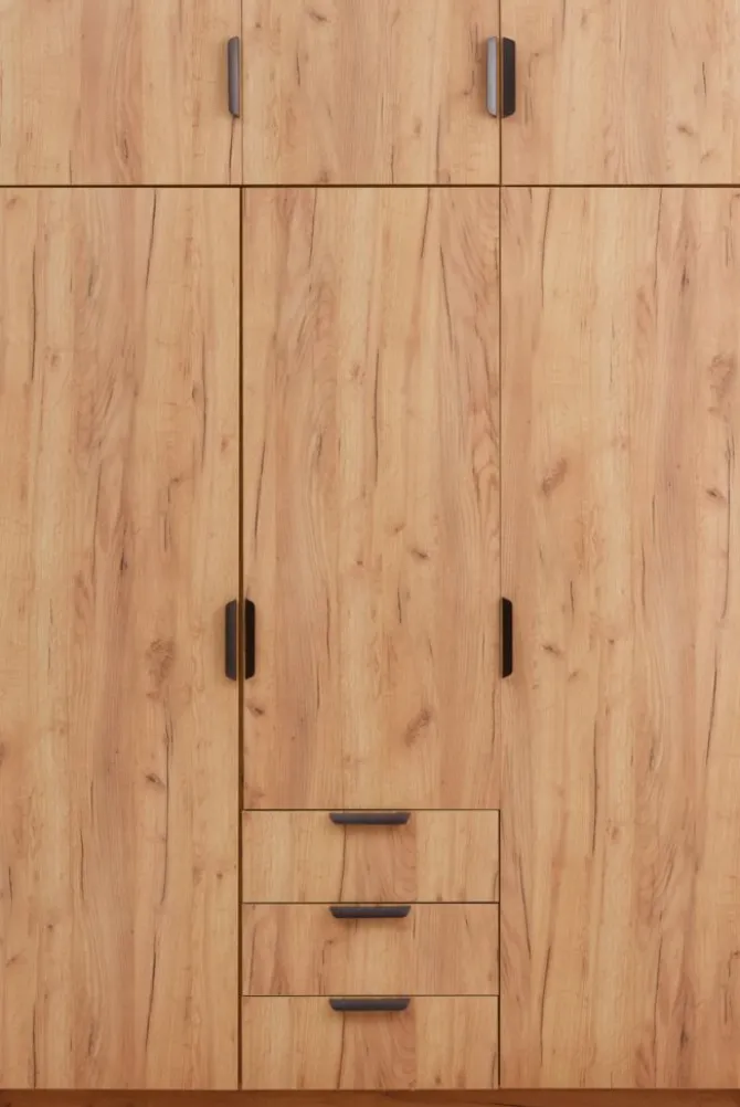 Kunstfiner. Skabets indretning: 4 hylder og 2 bøjlestænger. B144 x H176 x D50 cm