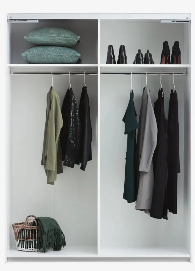 Kunstfiner. Med skydedøre. Skabets indretning: 2 hylder og 2 bøjlestænger. B151 x H201 x D66 cm
