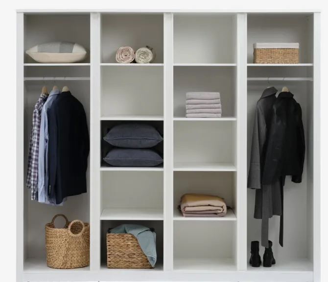 Kunstfiner. Skabets indretning: 10 hylder og 2 bøjlestænger. B220 x H197 x D61 cm