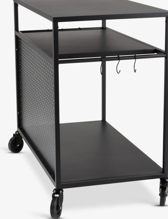 Sort grillbord med pulverlakeret stålramme og bordplade. Det kan bruges som base for en bordgasgrill og er ideel til at organisere redskaber og forsyninger, når man laver mad udendørs. De 2 hjul gør det nemt at flytte bordet rundt. Incl. 6 kroge. B50 x L90 x H84 cm