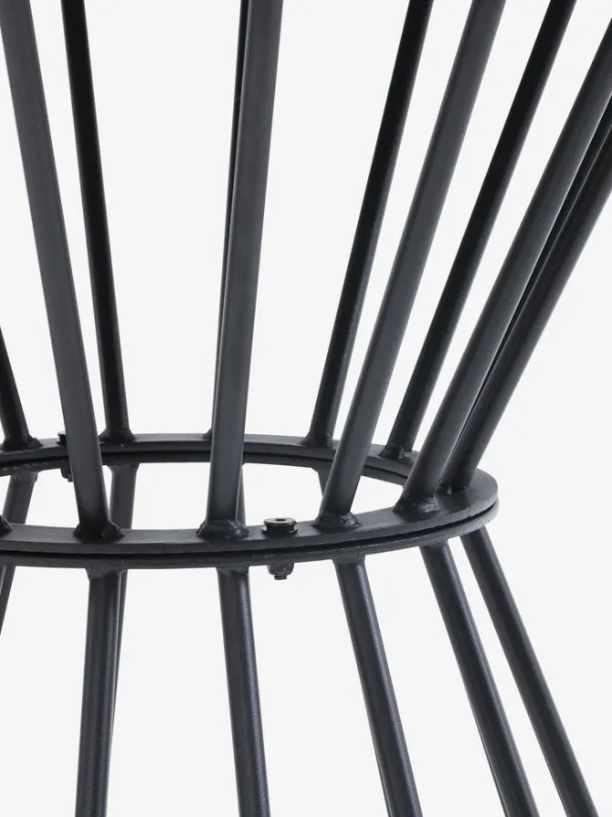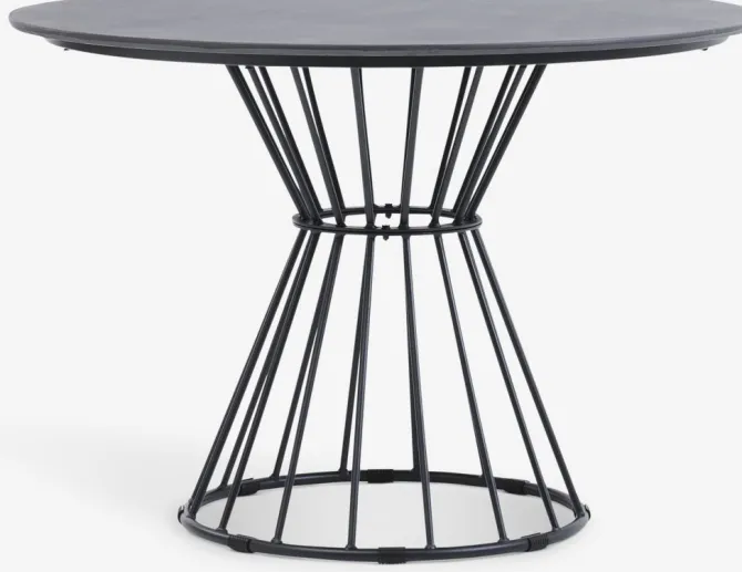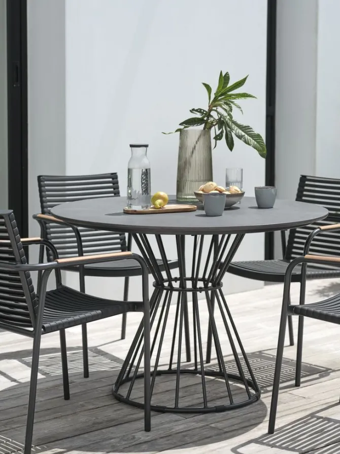 Rundt havebord med grå bordplade i varmebestandig fibercement og sort fod i pulverlakeret stål. Ø110 x H75 cm