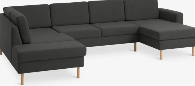 6-personers hjørnesofa i stof. Sæde- og ryghynder i skum. Ben i massiv bøg. Kan ikke spejlvendes. B300 x H81 x D87/155/205 cm