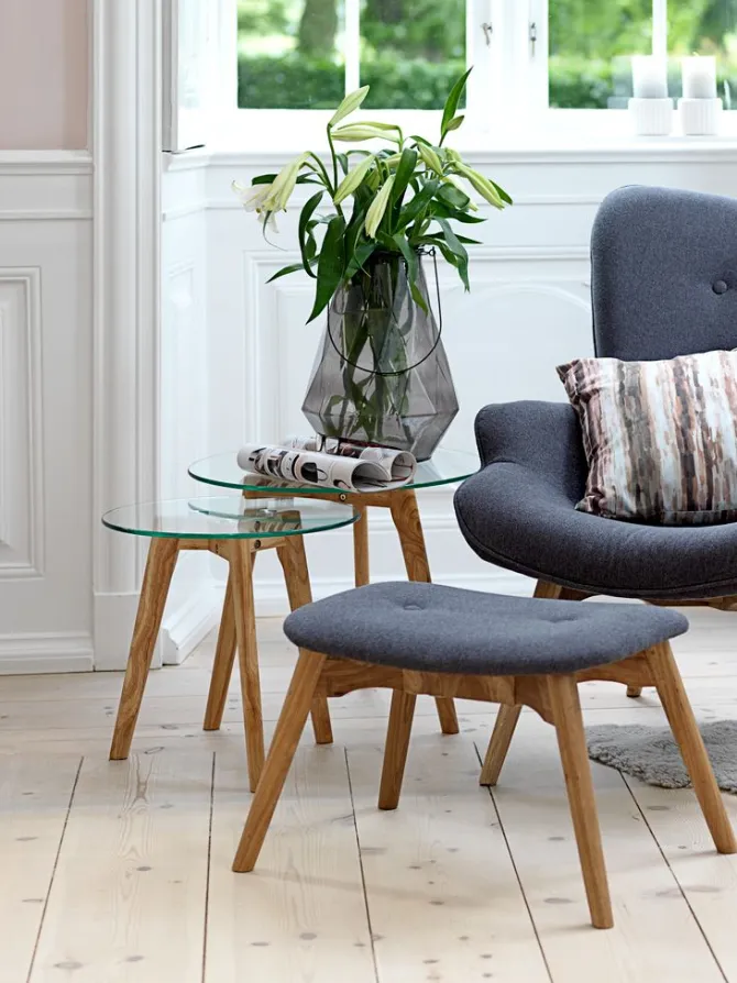 Massiv eg og hærdet glas. Ø50/40 x H45/40 cm