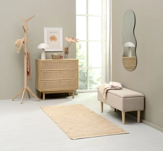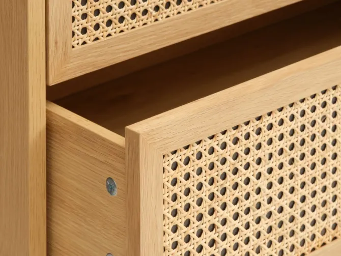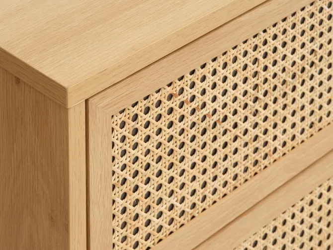 Massivt træ, rattan og kunstfiner. Skuffer med soft-close og fuldt udtræk. B85 x H85 x D45 cm