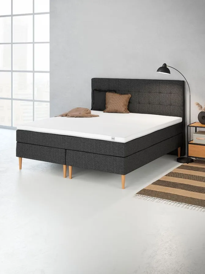 Kontinentalseng 180×200 cm. 2 skummadrasser med kerne af latex. Madrassen er inddelt i 7 komfortzoner, hvilket giver en unik, ergonomisk korrekt støtte. 1 topmadras, 8 cm tyk med kerne af åndbar latex, der effektivt leder overskydende varme væk. Det vaskbare strækbetræk er kraftigt quiltet med purskum. Basen består af 2 boxmadrasser med pocket-fjedre 250/m². Inkl. ben. Ekskl. gavl.