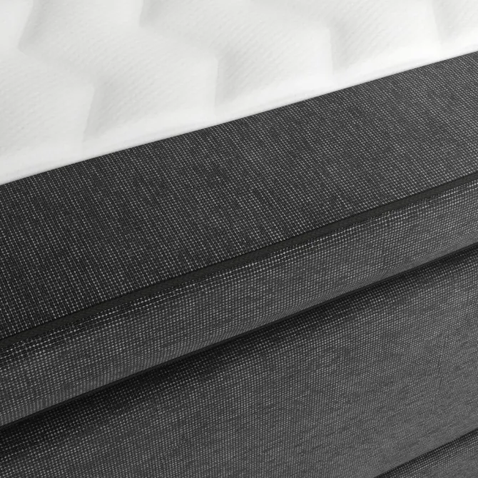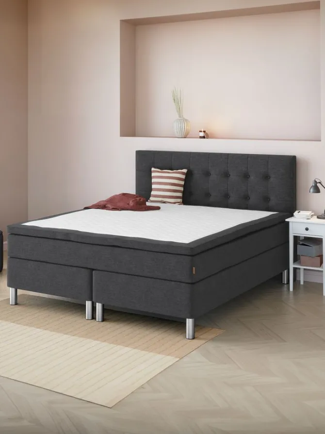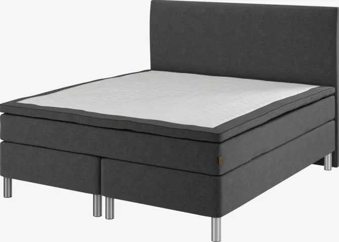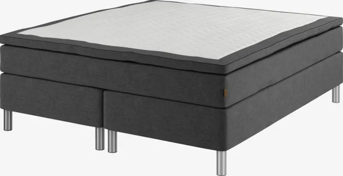 Kontinentalseng 180×200 cm. 1 springmadras med pocket-fjedre 260/m², polstret med koldskum og purskum. Madrassen er inddelt i 7 komfortzoner, hvilket giver en unik, ergonomisk korrekt støtte. 1 topmadras, 7 cm tyk med kerne af trykaflastende memory foam, der former sig præcist efter kroppen. Strækbetræk med blød, kraftig quiltning. Basen består af 2 boxmadrasser med bonell-fjedre 110/m². Inkl. ben. Ekskl. gavl.