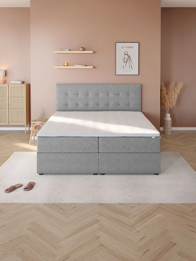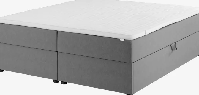Kontinentalseng 180×200 cm. 2 springmadrasser med pocket-fjedre 233/m², polstret med purskum. 1 topmadras, 6 cm tyk med kerne af trykaflastende memory foam, der former sig præcist efter kroppen. Vaskbart betræk med blød, kraftig quiltning. Basen består af 2 rammer. Med opbevaringsplads. Inkl. ben. Ekskl. gavl.