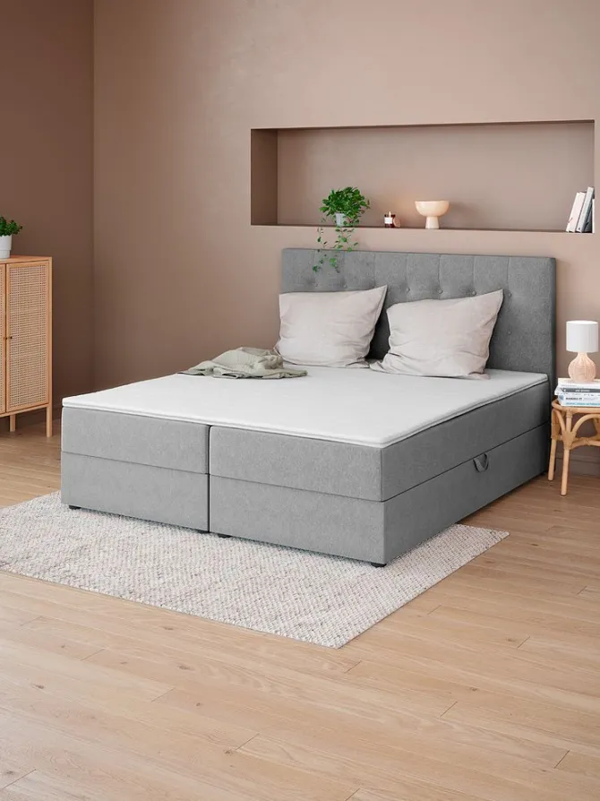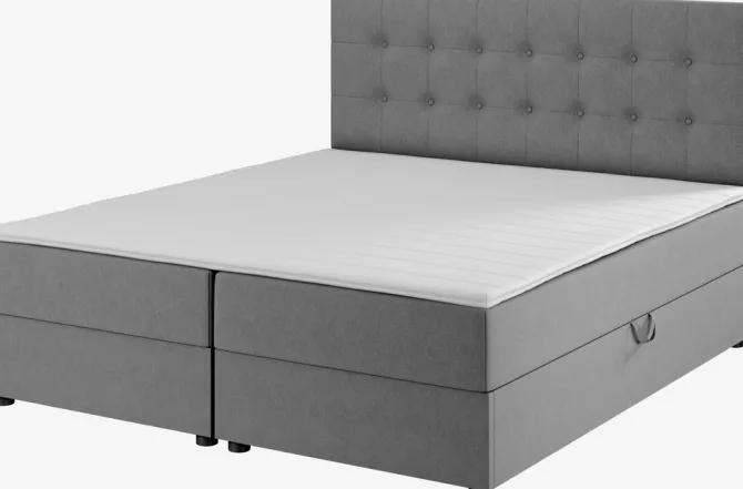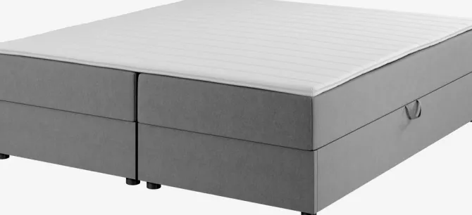 Kontinentalseng 180×200 cm. 2 springmadrasser med bonellfjedre 240/m², polstret med purskum. 1 topmadras, 3 cm tyk med kerne af purskum. Vaskbart betræk. Basen består af 2 polstrede rammer. Med opbevaringsplads. Inkl. ben. Ekskl. gavl.
