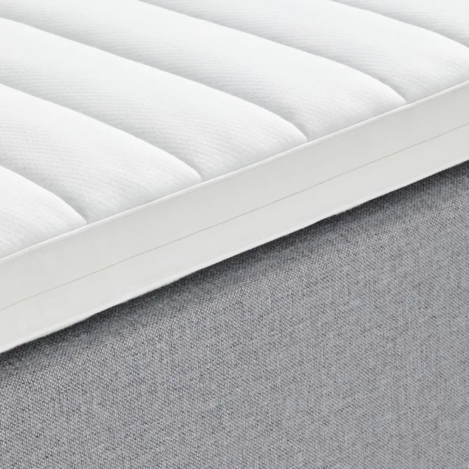 Kontinentalseng 180×200 cm. 1 vendbar springmadras med pocket-fjedre 210/m², polstret med purskum. 1 topmadras, 9 cm tyk med kerne af purskum. Vaskbart strækbetræk med blød, kraftig quiltning. Basen består af 1 ramme. Inkl. ben. Ekskl. gavl.