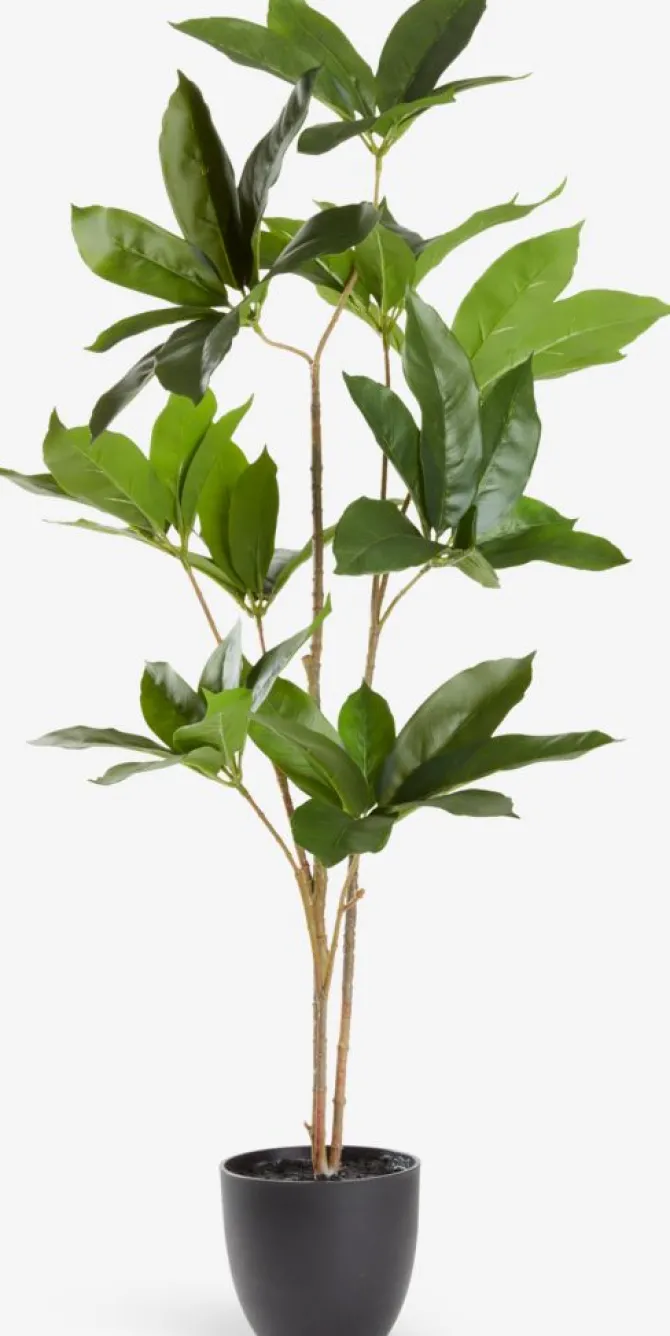 Kunstig plante med grønne blade og en sort potte. Denne dekorative plante tilføjer et strejf af natur til dit hjem uden behov for vedligeholdelse. Placer den i ethvert rum for at skabe en frisk og grøn atmosfære. H90 cm