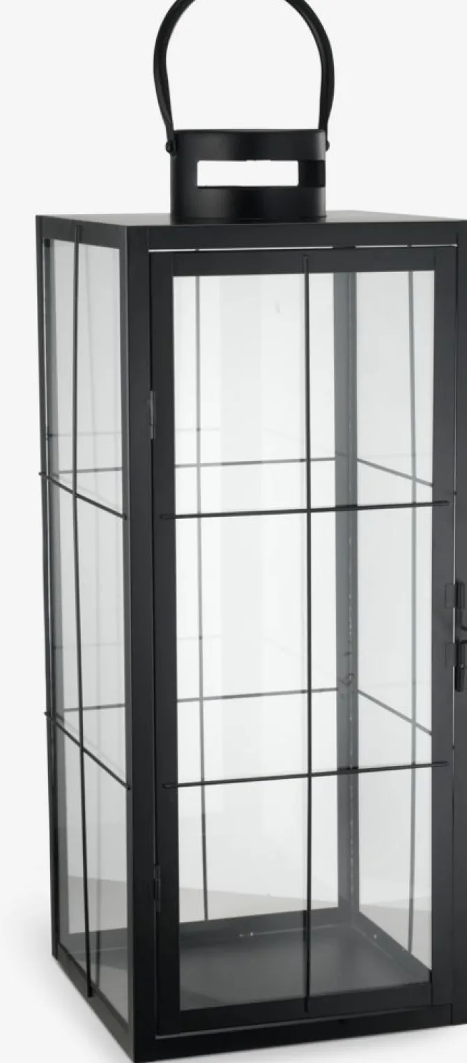Sort lanterne i glas og stål med et enkelt og tidløst design. Lanternen har en robust stålramme og klare glaspaneler, der giver et elegant udtryk og gør det nemt at se lyset indeni. Den er udstyret med en praktisk hank for nem transport og placering. Perfekt til at skabe en hyggelig atmosfære i hjemmet. B20 x L20 x H50 cm