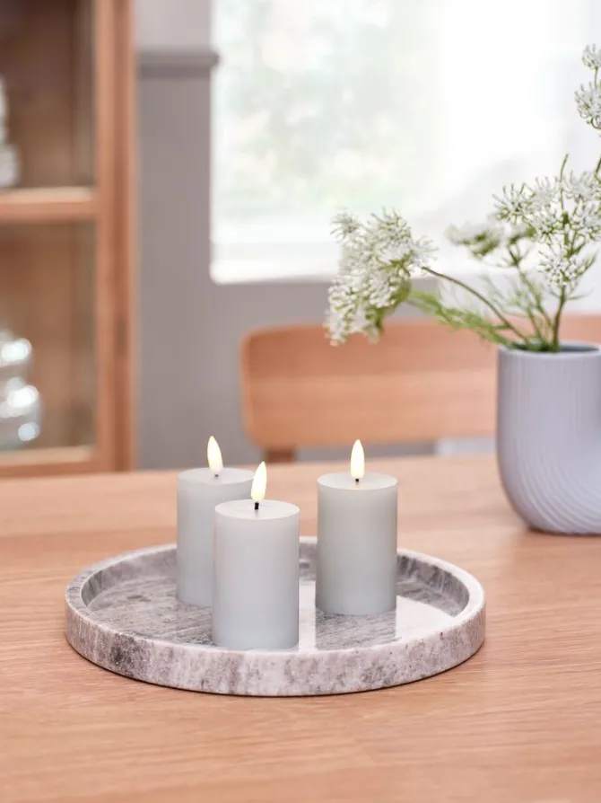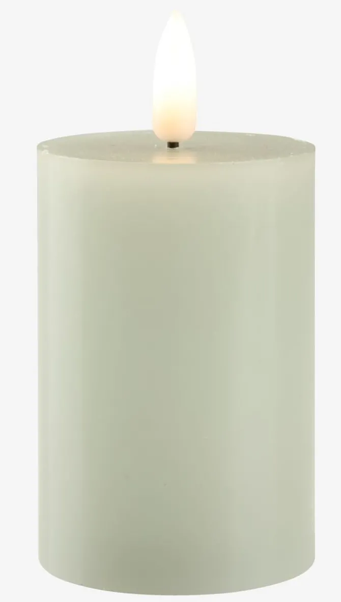 Lysegrå LED bloklys med glat overflade og timerfunktion. Dette stearinlys er designet til indendørs brug og har en lystid på 6 timer med en automatisk slukning efter 18 timer. Det kræver 1 stk CR2032 batteri, som ikke er inkluderet. Perfekt til at skabe en hyggelig atmosfære i hjemmet. Ø5 x H8 cm
