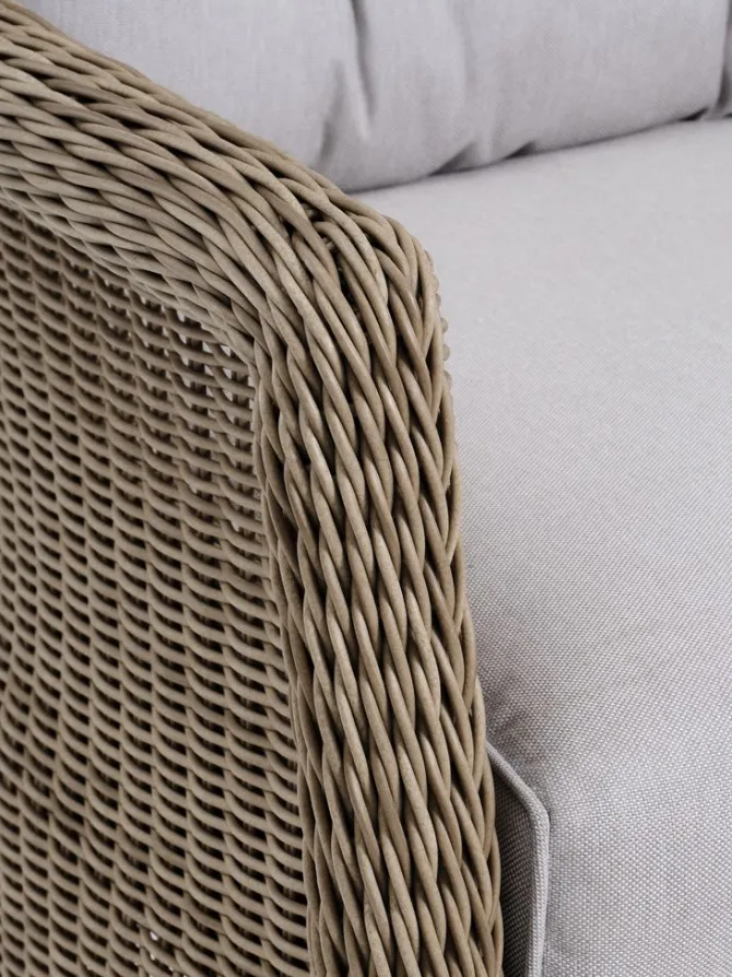 4-personers loungesæt. Bord: Aluminium, DURAWOOD® komposittræ og polyrattan. DURAWOOD® er et slidstærkt sammensat materiale, bestående af FSC®-hårdttræsfibre og plast. B84 x L127 x H65 cm. Stol: Aluminium og polyrattan. Inkl. luksushynder med slidstærkt, strukturvævet betræk.