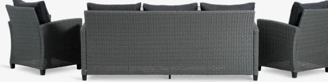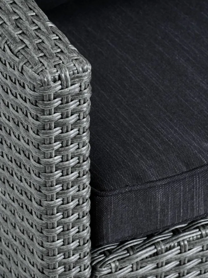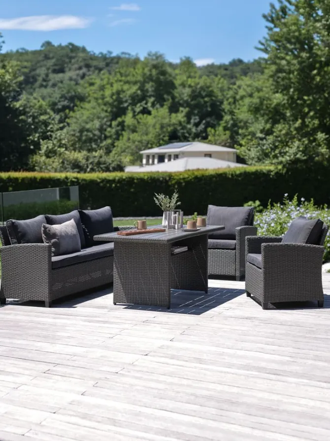 5-personers loungesæt. Bord: Stål, kunsttræ og polyrattan. B75 x L130 x H67 cm. 3-personers sofa og stol: Stål og polyrattan. Inkl. luksushynder med slidstærkt, strukturvævet betræk.