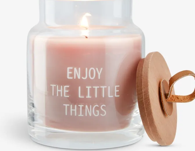 Rosafarvet lys i en klar glaskrukke med en glat finish og et trælåg. Lyset har en brændetid på 30 timer, hvilket gør det perfekt til at skabe en varm og hyggelig atmosfære indendørs. Ø9 x H11 cm