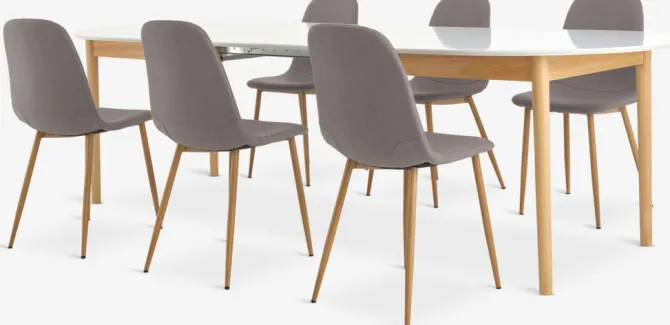 Bord: Massivt træ og MDF. Inkl. 2 tillægsplader, som kan opbevares under bordpladen. B100 x L200/240/280 x H75 cm. Stol: Stof og stål.