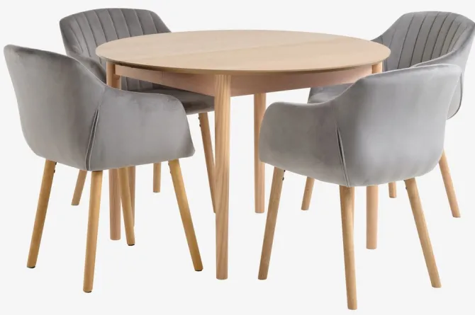 MARSTRAND Ø110 bord eg + 4 ADSLEV stole grå velour