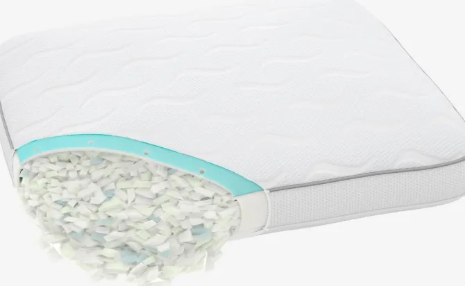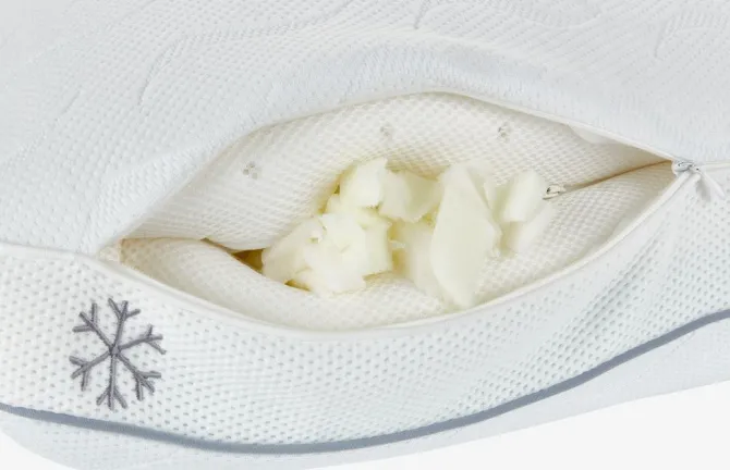 Memory foam pude 48x58x15 cm i trykaflastende, strimlet AIR memory foam med kølende gel. AIR memory foam former sig hurtigt og præcist efter nakke og skuldre, selv i et køligt sovemiljø. Pudens ene side har et lag af kølende gel, som giver dig mulighed for at skifte mellem en almindelig og en køligere side. Pudens højde kan justeres ved at fjerne noget af fyldet. Betræk i polyester, med kølende polyethylen på den ene side, som kan vaskes ved 40°C. Quiltet med AIR memory foam.