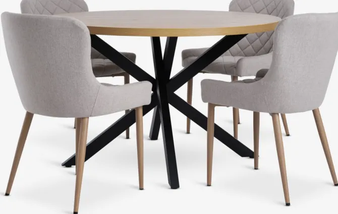 NORTOFT Ø120 bord + 4 BELLINGE stole sand/eg