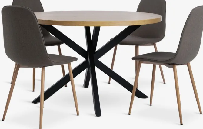 Bord: Kunstfiner og stål. Ø120 x H75 cm. Stol: Stof og stål.