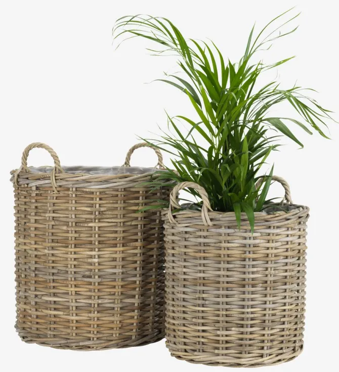 Sæt med 2 plantekurve i flettet kubu og rattan med plastikforing. Disse alsidige, rustikke kurve er ideelle til planter eller dekorativ opbevaring. Håndtagene gør det nemt at flytte kurvene rundt og placere dem efter ønske. Ø50/40 x H58/48 cm