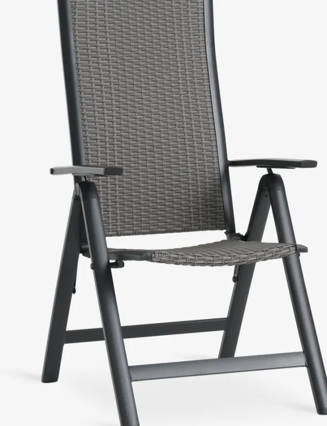 Grå positionsstol med sæde og ryglæn i polyrattan og stel i pulverlakeret aluminium. Ryglænet kan lænes tilbage i 6 positioner. Polyrattan giver et naturligt fletlook, samtidig med at det er vejrbestandigt og vedligeholdelsesfrit. Aluminium er et let og robust materiale, der ikke ruster. Havestolen kan klappes fladt sammen, hvilket gør den nem at bære og opbevare.