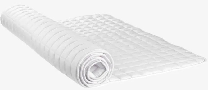 Kogeægte rullemadras 80×200 cm med blød, kraftig quiltning af silikoniserede hul-fibre (100% genanvendt). Elastiske stropper i hjørnerne.