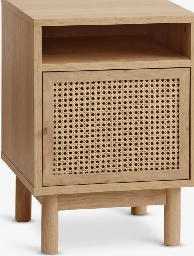 Massivt træ, polyrattan og kunstfiner. Låge med soft-close. B40 x H57 x D40 cm