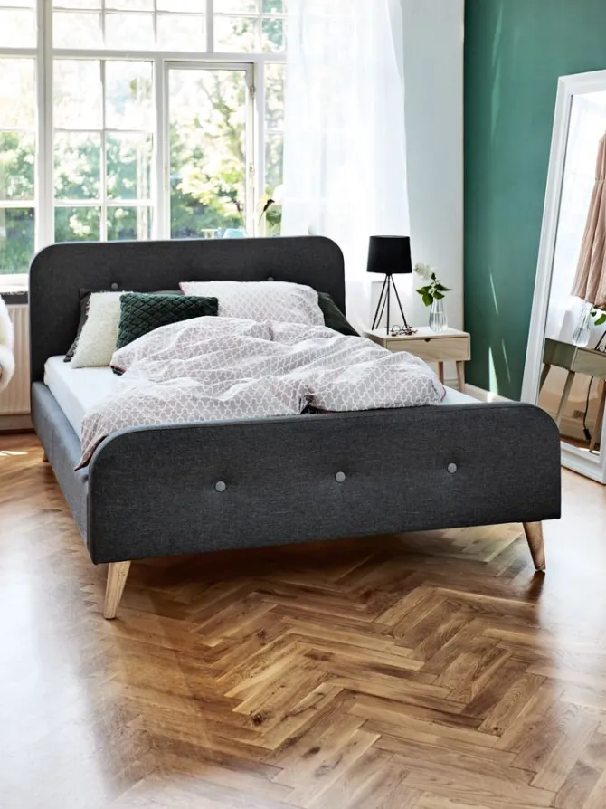 Stof og massivt træ. Passer til box-, spring- og skummadrasser 140×200 cm. Ekskl. bund og madras. B156 x L216 x H101 cm