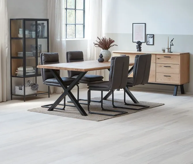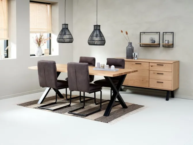 Massivt træ og egefiner. Låger med soft-close. Skuffer med fuldt udtræk. B160 x H85 x D45 cm