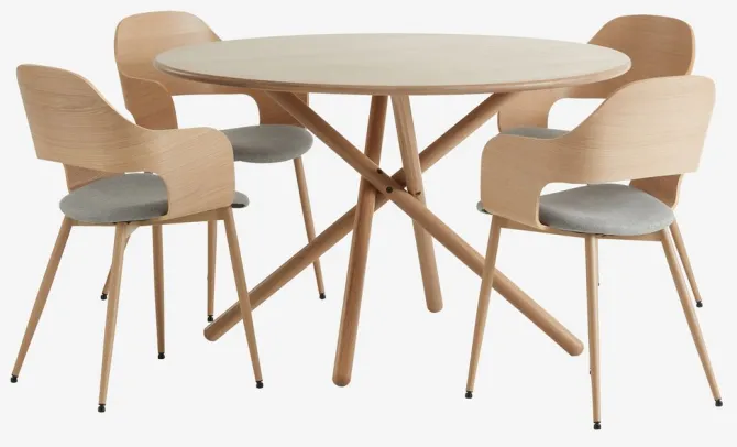 Bord: Massiv eg og egefiner. Ø120 x H75 cm. Stol: Stof, egefiner og stål.