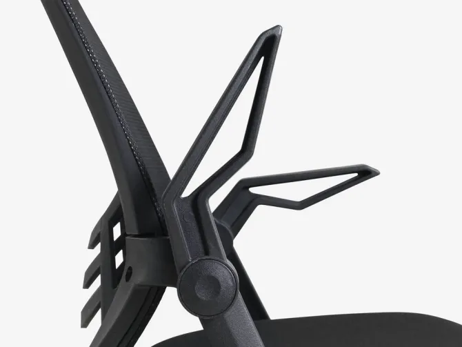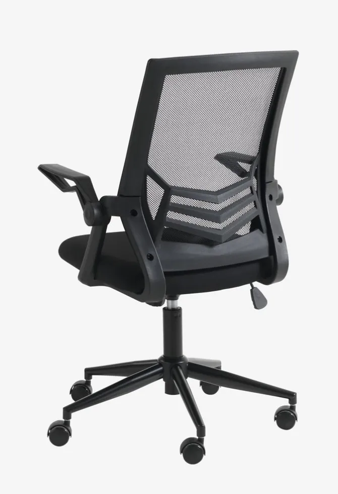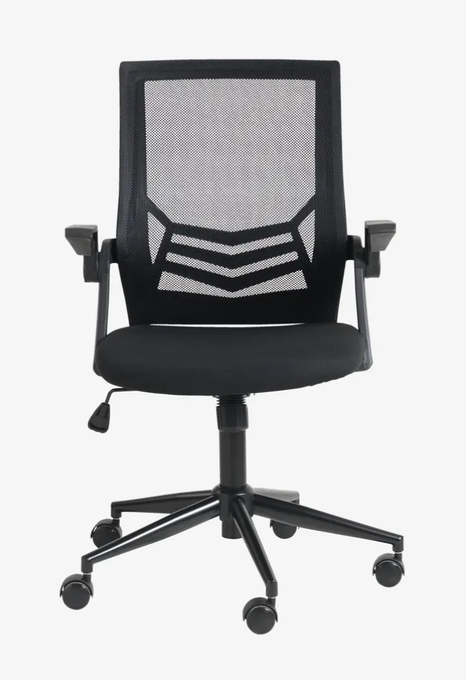 Stof og mesh. Stel i metal. Med lændestøtte, flip-op armlæn, justerbar højde og trinløs vippefunktion. B59 x H95-107 x D61 cm