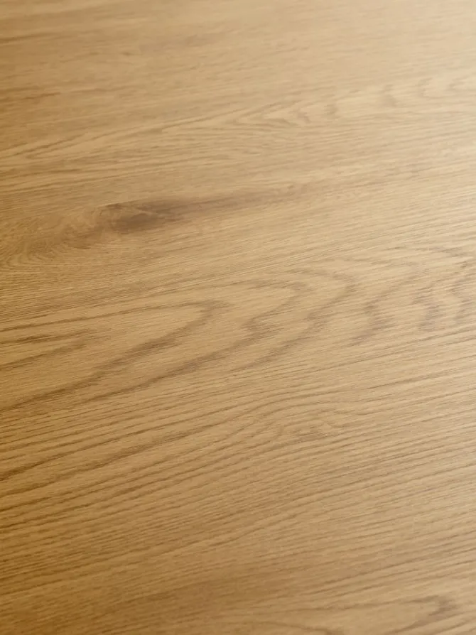Spisebord med bordplade i kunstfiner med egetræslook og matchende ben i stål. Ø120 x H75 cm