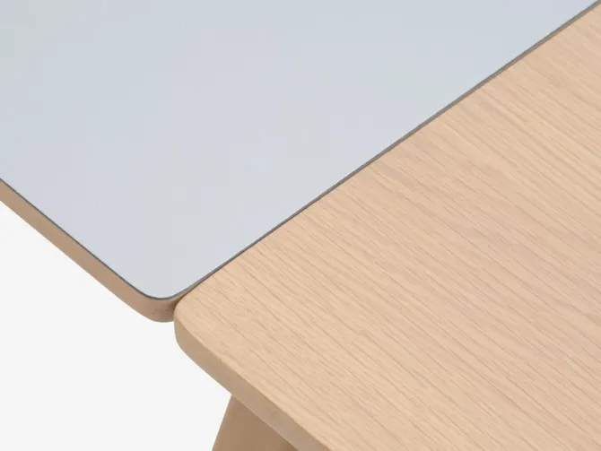 Spisebord inkl. 2 tillægsplader. Lysegrå bordplade i slidstærkt højtrykslaminat. Bordkanten har et egetræslook, som matcher tillægspladerne i egetræsfiner. Ben i massiv eg. Træet er lakeret for at forlænge holdbarheden. Du kan nemt forlænge bordet til enten 205 eller 250 cm for at rumme større sammenkomster. B90 x L160 x H75 cm