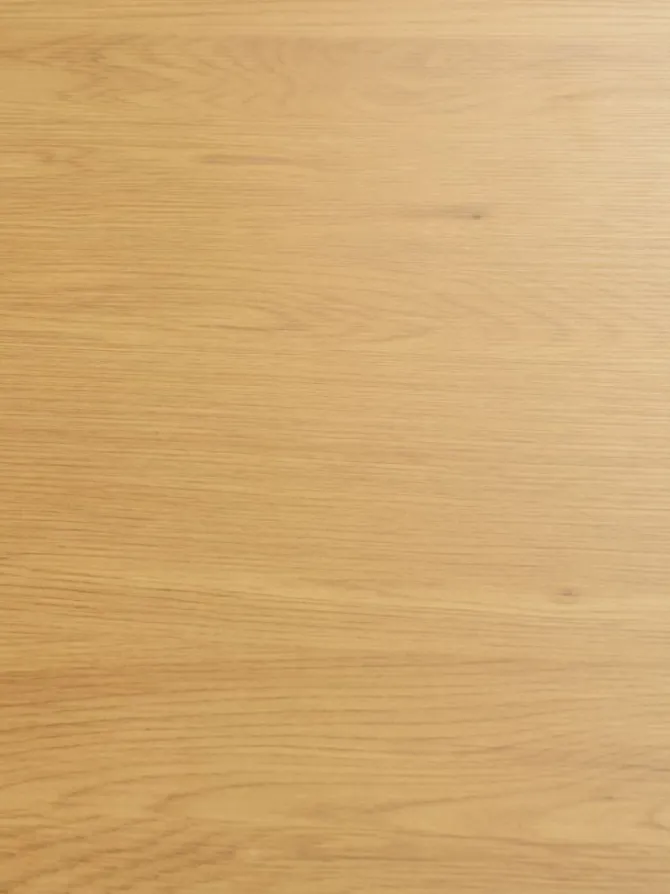 Rundt spisebord med bordplade i kunstfiner med egetræslook og sorte ben i stål. Ø120 x H75 cm