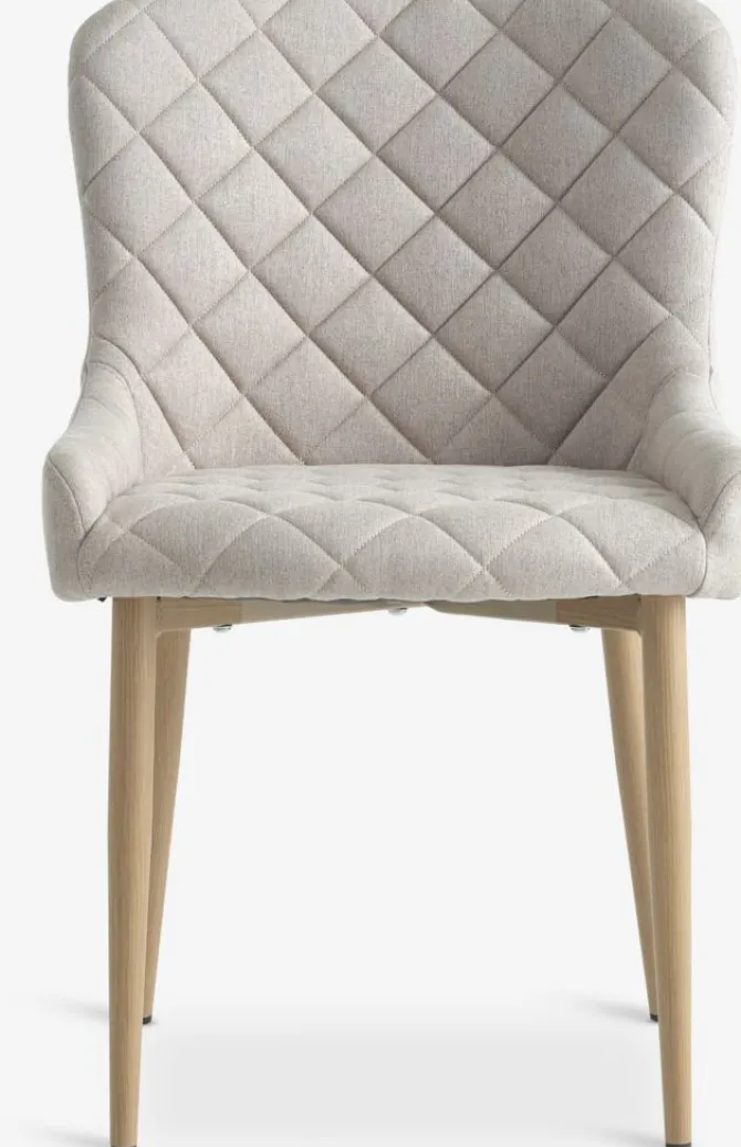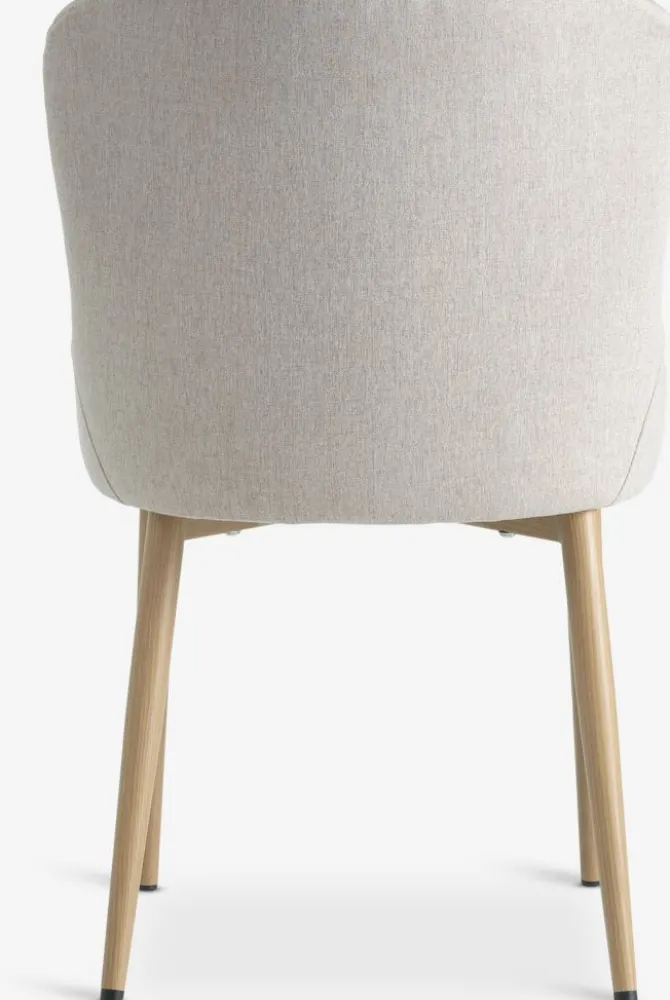 Spisebordsstol med polstret sæde og ryglæn i sandfarvet stof. Ben i stål med egetræslook.