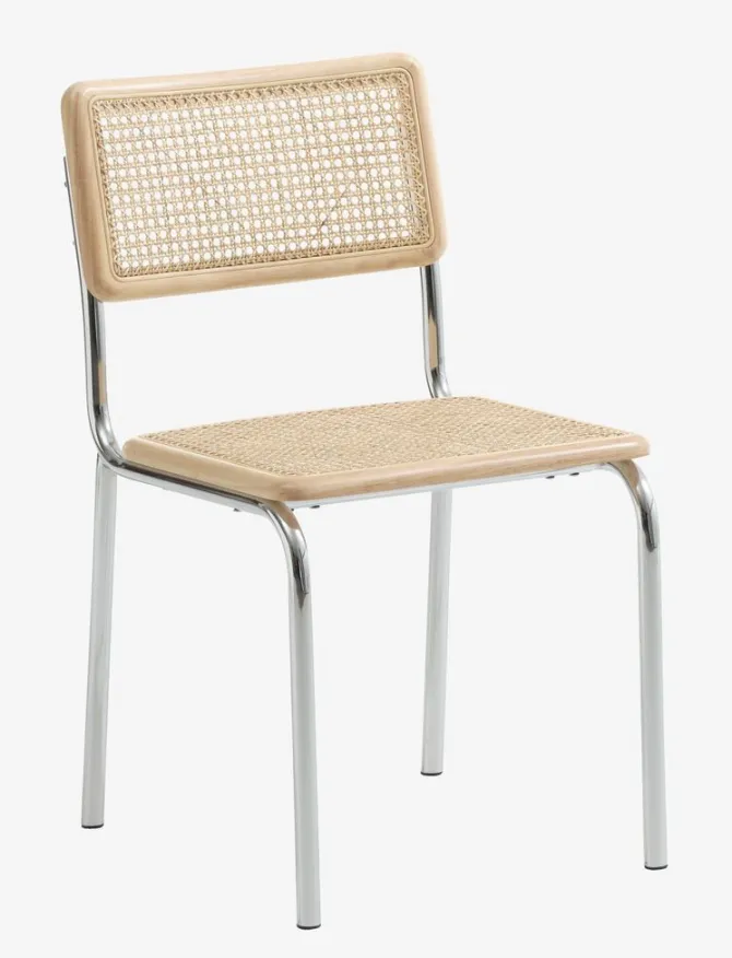 Spisebordsstol med sæde og ryglæn i rattan indrammet i massivt træ. Ramme i krom.