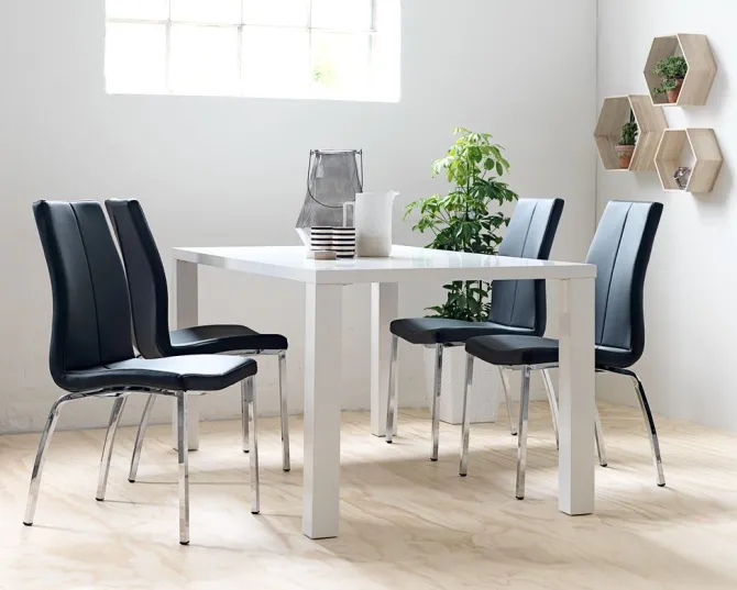 Spisebordsstol med polstret sæde og ryglæn i sort kunstlæder. Ben i krom.